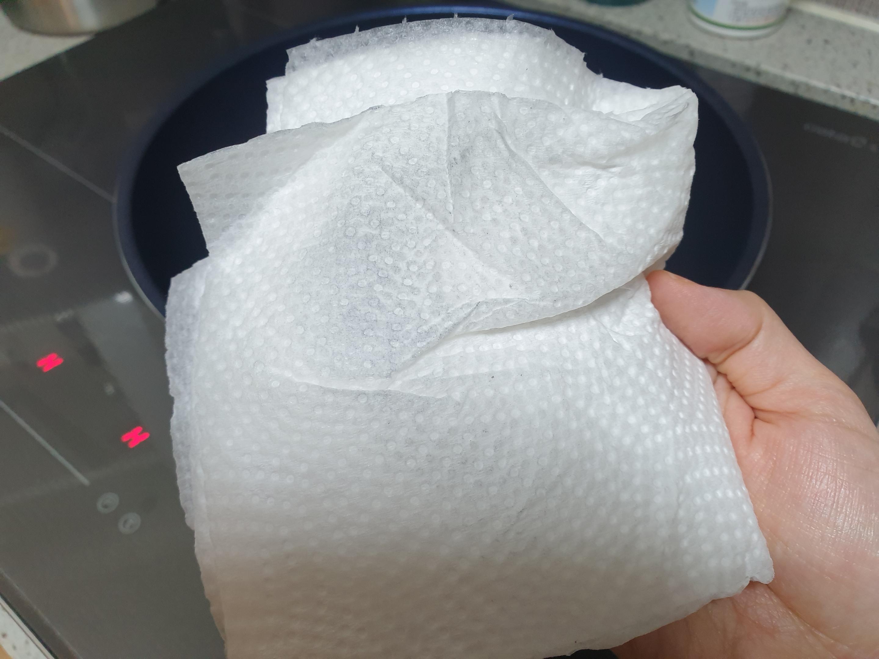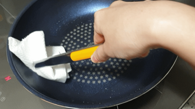 레인지의 불은 끄고 남은 잔열이 있는 상태에서 손을 데이지 않게 조심하며 키친타월로 기름을 닦아내어 줍니다.