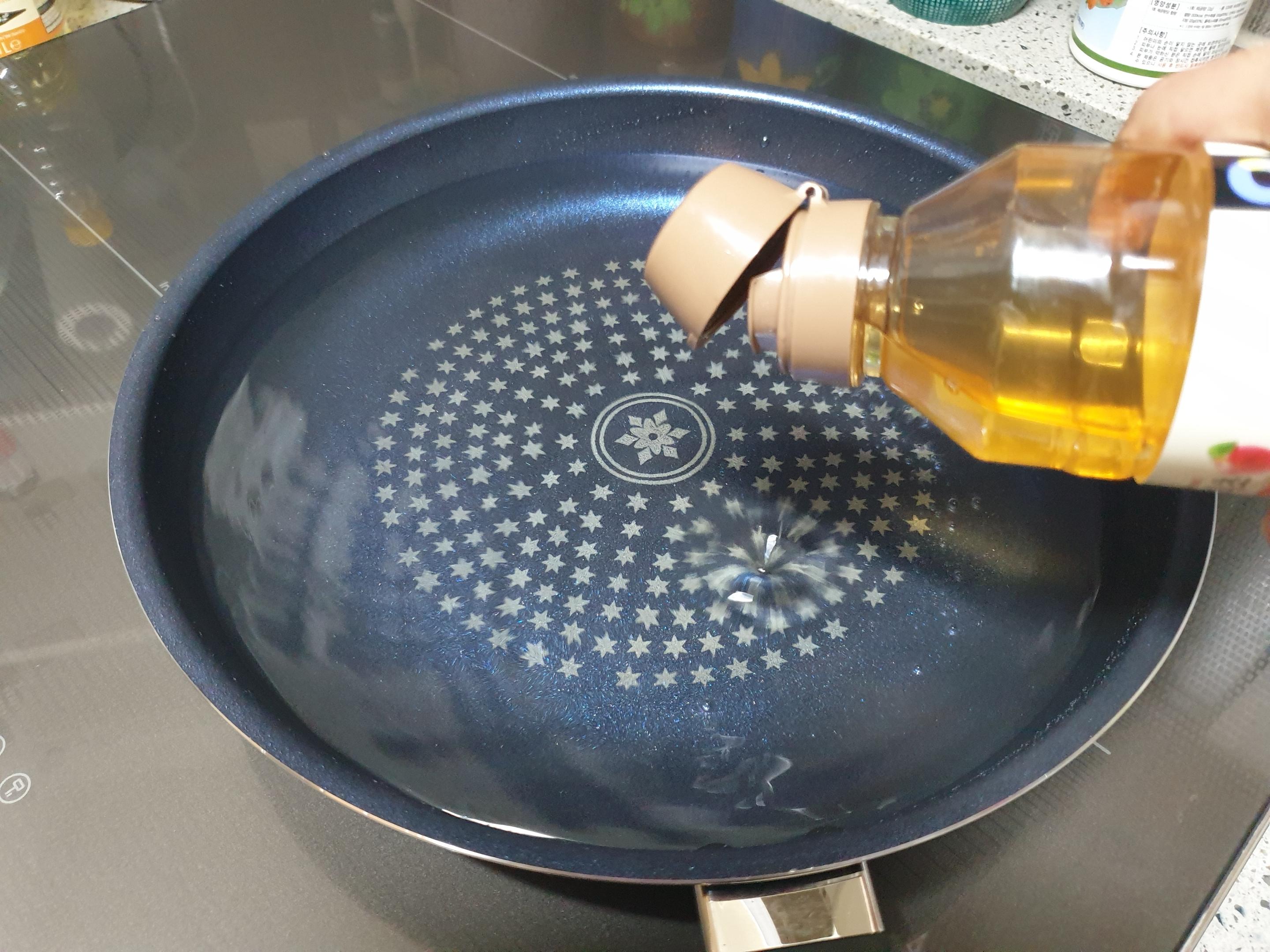 달궈진 프라이팬에 식용유를 2~3숟가락 정도의 양을 눈대중하여 둘러주었습니다.